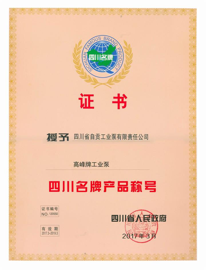 日前,我公司收到四川省人民政府颁发的《四川**证书》,公司高峰牌工业泵被授予第十二届“四川**产品”称号。据悉,公司产品是继2014年荣获第十一届“四川**产品”后,再次获此殊荣。